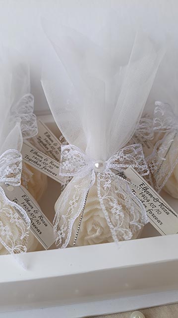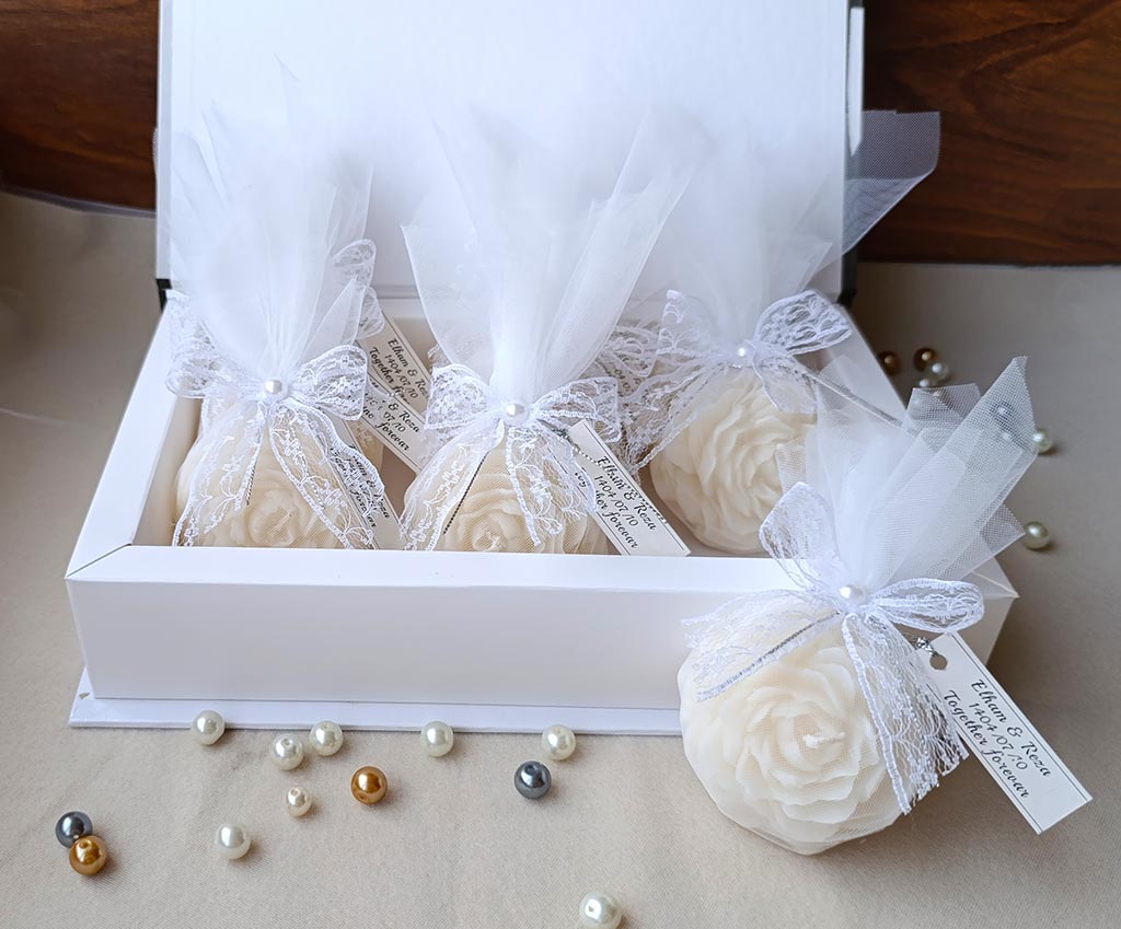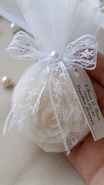 - دستساز با عشق: هر گیفت شمع عروسی گل آلاله با تور با کلی دقت و ظرافت درست شده تا حس خاص بودن رو به تو و مهمونات بده.