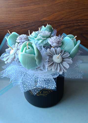 - ترکیب گلهای تازه 🌸 و شمعهای مردانه با طراحی زیبا و جذاب
