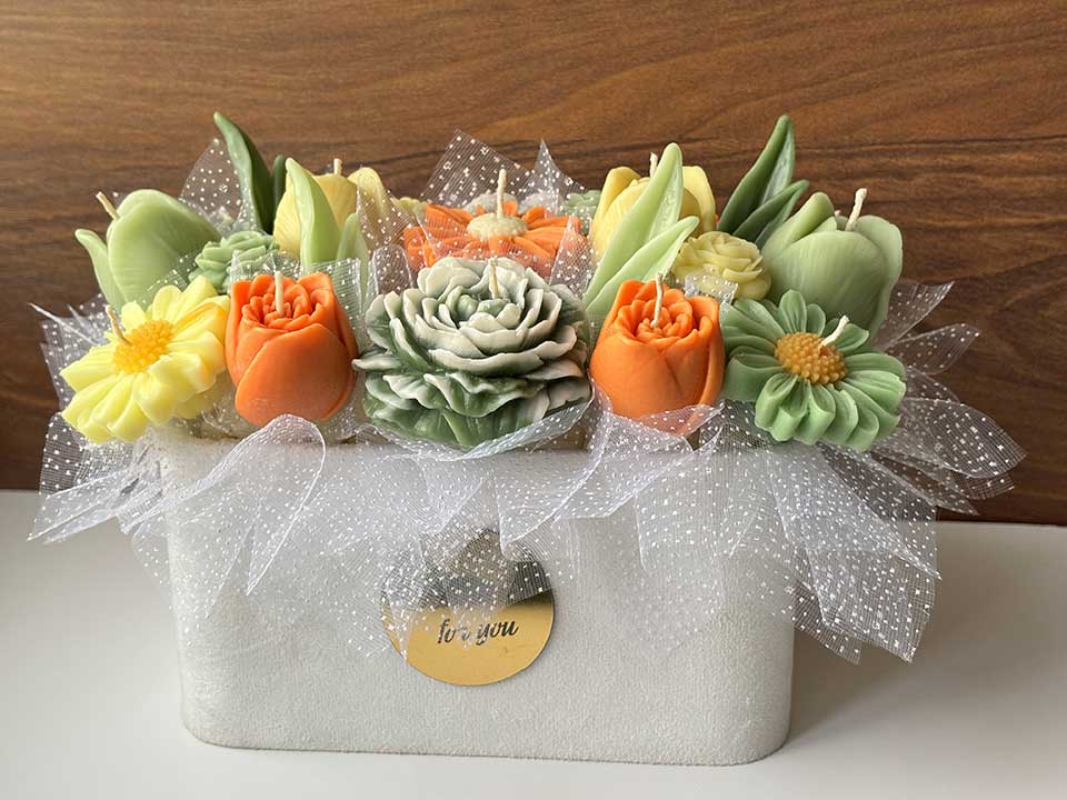 - **باکس گل شمعی**: ترکیبی از گلهای تازه یا مصنوعی با شمعهای تزئینی که زیبایی طبیعت را با نور شمع ادغام میکند. این باکسها برای خانمها و آقایان جذاب هستند و میتوانند به عنوان هدیهای شخصیسازیشده عمل کنند.