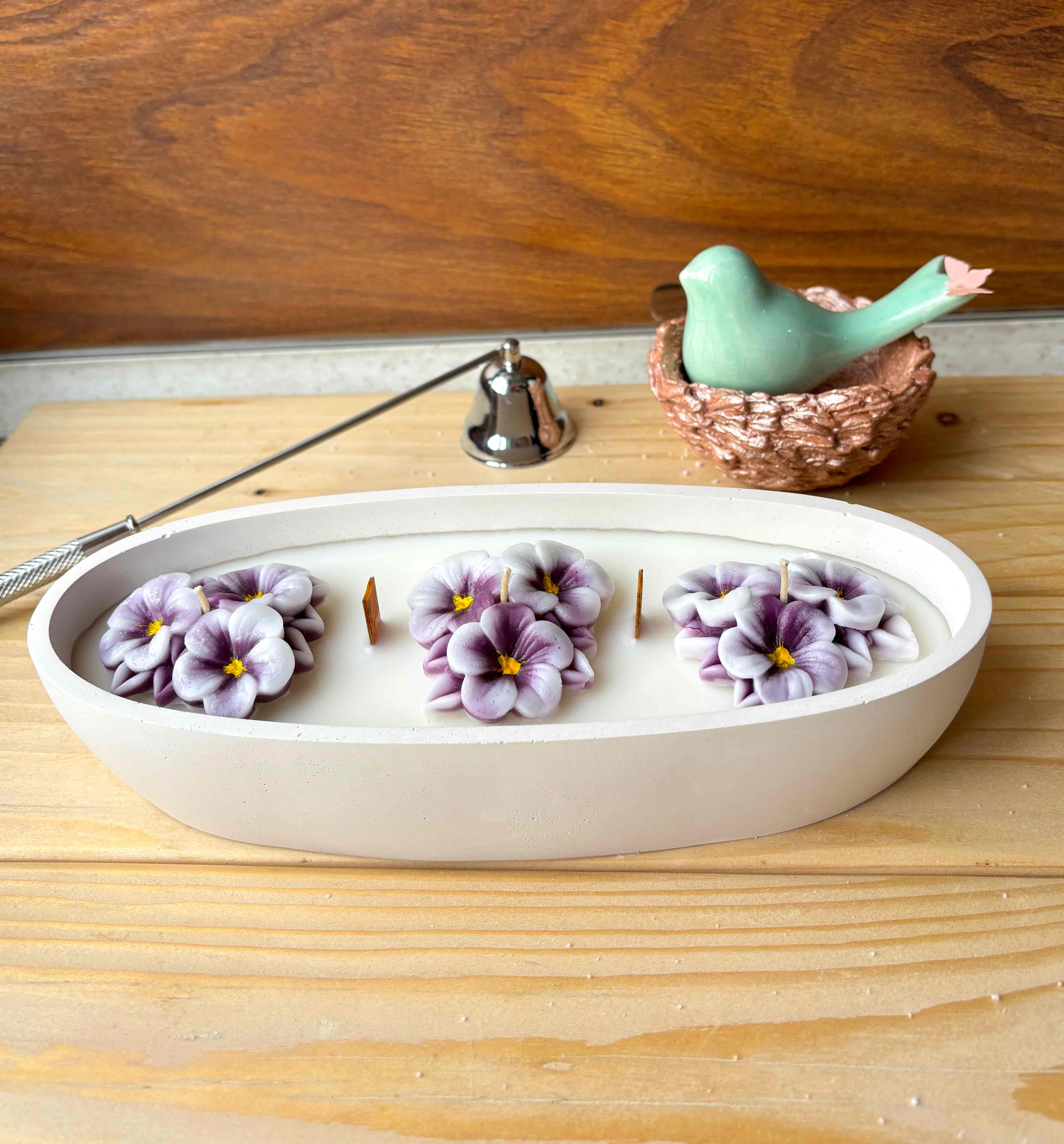 قیمت شمع قایقی با فتیله چوبی فانتزی و سه گل یخ بنفش و سفید